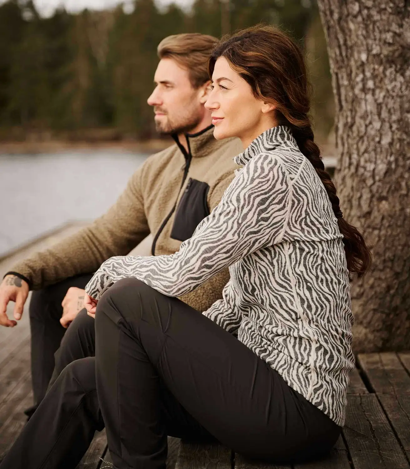 – Jag älskar vårt nya mönster Wave, som jag tror kommer bli en storsäljare på Dam! Det är vår tolkning av den stora trenden med djurmönster. Plaggen är gjorda i vår signaturkvalitet Merino Warm som är en 2-lagerskonstruktion med ull på utsidan och mjukt funktionsmaterial på insidan. Mönstret hittar man på en ½ Zip-tröja, ett pannband och handledsvärmare.
