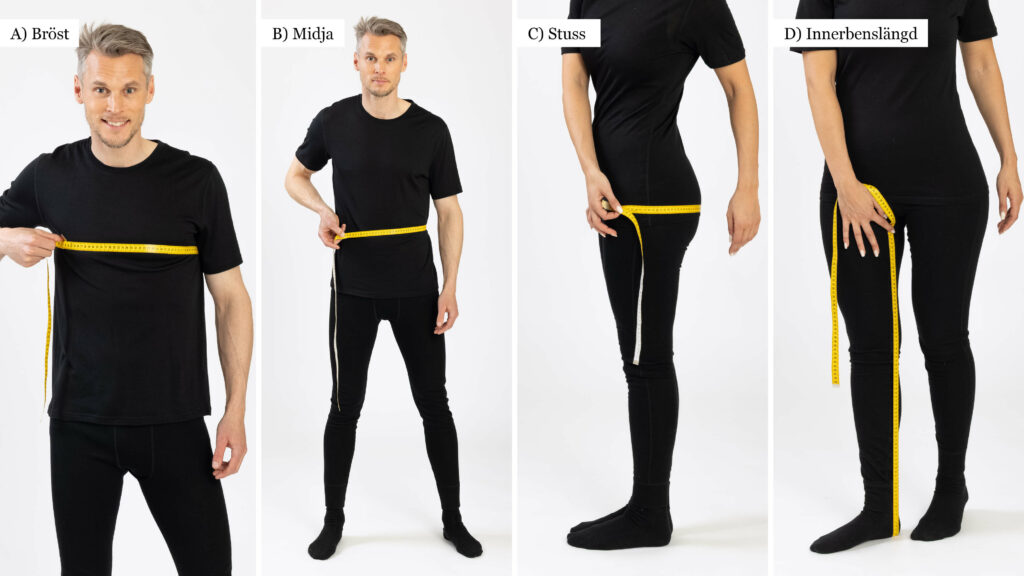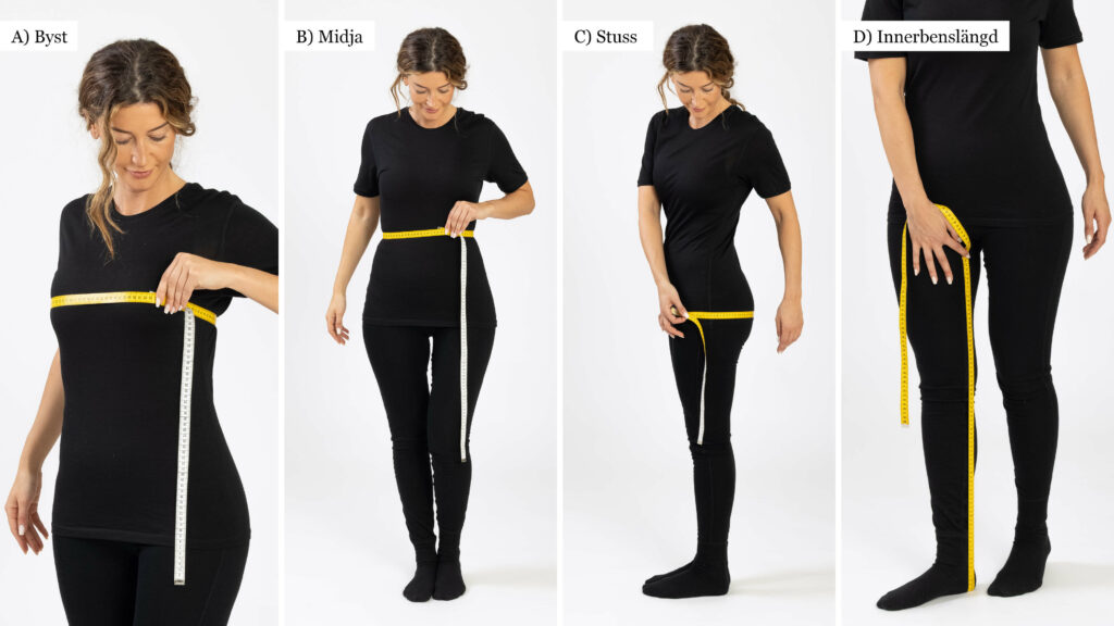 Osäker på vilken storlek du ska ha? Leta fram ett måttband och mät bystvidd, midjevidd, stussvidd och innerbenslängd direkt på kroppen. Kika sedan i tabellen nedan för att se vilken storlek som är rätt för just dig. Alla mått är i centimeter.
